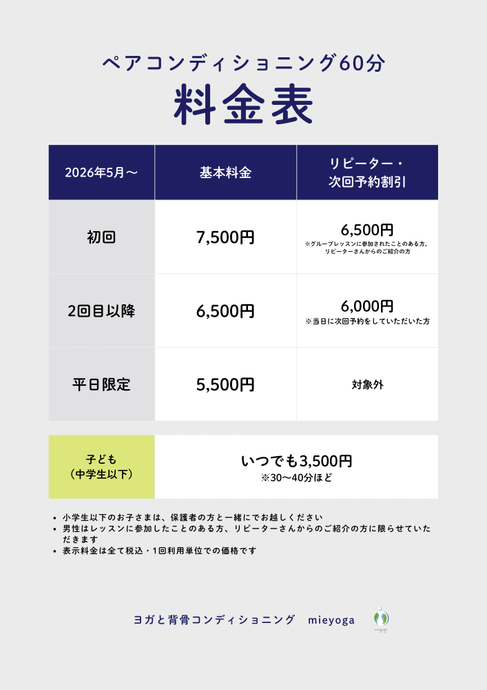 | 《価格改定のご案内》 2026年5月より、 ペアコンディショニング料金を 一部変更させていただきます ご迷惑をおかけいたしますが、 ご理解いただけますよう よろしくお願いいたします \平日限定!/ ⚫︎5,000円/60分 (2026年5月以降〜5,500円) *どなたでも、何回でも利用OK! 平日限定の割引料金です ⚫︎初回料金 7,000円/60分 (2026年5月以降〜7,500円) *中学生以下の方は、いつでも3,000円/40分ほど (2026年5月以降〜3,500円) ⚫︎メンバー料金(2回目以降) 6,000円/60分 (2026年5月以降〜6,500円) *グループレッスンに参加された事がある方 *リピーターさま *ご紹介の方 ※当日に次回のご予約を頂くと、 次回500円引きさせていただきます(平日除く) ※出張レッスンご希望の場合、 全メニューに出張料(都内1,000円)が追加となります |