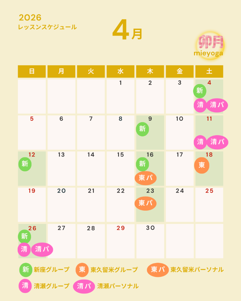 | 【4月】 ・4日(土)15時 ・11日(土)15時30分 ・26日(日)15時 【5月】 ・10日(日)15時 ・16日(土)15時30分 ・24日(日)15時 ※清瀬クラスのグループレッスン後 |